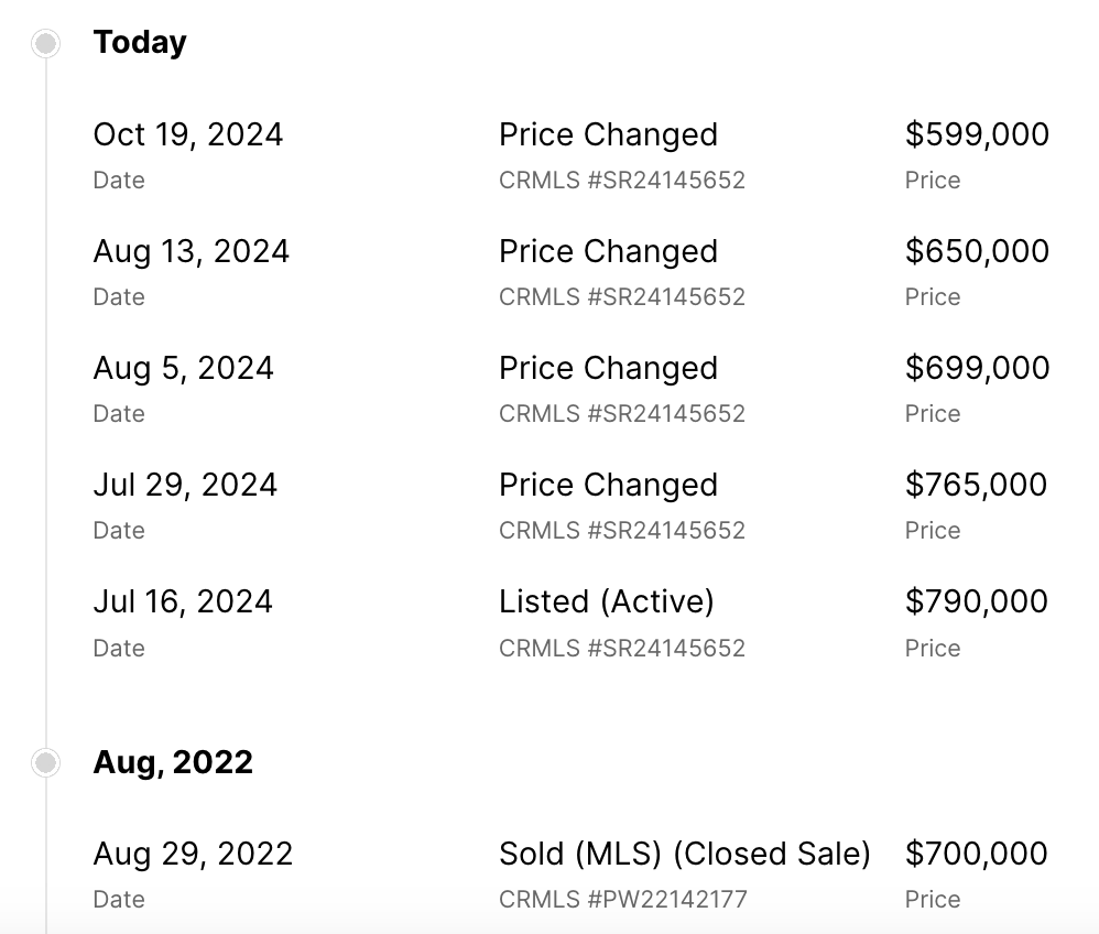 This poor soul paid $700,000 in August 2022 and is now willing to take a $136,000 loss to be free of their financial prison. Considering their down payment was $140,000, this is shit-your-pants-and-pray-for-heavenly-intervention time. They cannot lower the price any further without writing a check at closing.